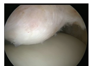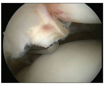 Một lưỡi cạo (shaver) 4,0 mm được sử dụng để cắt lọc và chuẩn bị bề mặt bám của MPFL trên bánh chè [Hình 1]. Sau khi chuẩn bị xong bề mặt, camera được chuyển sang cổng dưới trong. Một neo chỉ hoàn toàn 2,9 mm có hai sợi (Q-Fix™, Smith and Nephew) được đặt vào mặt trong của bánh chè qua cổng trên trong, dưới quan sát nội soi.