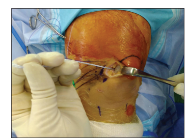 Kim tủy sống được sử dụng để đưa các vòng polydioxanone vào khớp như một thiết bị luồn chỉ — vật liệu dễ tìm và ít gây tổn thương mô mềm. Bốn vòng polydioxanone được chuẩn bị sẵn ngoài da, cách bờ trong của bánh chè khoảng 2,5 cm, sau đó được đâm vào khớp xuyên qua phần MPFL còn nguyên vẹn dưới quan sát trực tiếp qua nội soi, nhằm đảm bảo bắt đủ mô để phục hồi [Hình 2].