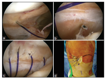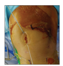 Tiếp theo, mỗi đầu chỉ được kéo ra khỏi khớp qua da bằng các vòng polydioxanone [Hình 3]. Vết mổ nhỏ tại cổng trên trong được mở rộng khoảng 2–3 cm để rút đầu chỉ ra ngoài qua lớp dưới da bằng kẹp Kelly [Hình 4].