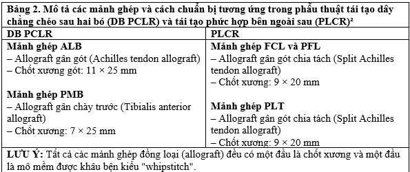 Các bước tái tạo PCL, PLC và cố định xương mâm chày trong. hướng dẫn từng bước và các kinh nghiệm phẫu thuật được trình bày trong Bảng 1. Phần chuẩn bị gân ghép được nêu chi tiết trong Bảng 2.