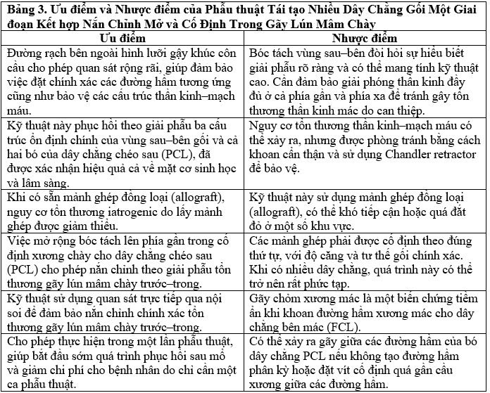 Kỹ thuật này không hoàn toàn không có nhược điểm và hạn chế. Kỹ thuật này sử dụng allografts cho cả PCLR và PLCR, điều này có thể gây khó khăn do hạn chế về khả năng tiếp cận hoặc chi phí cao. Việc khoan tổng cộng 6 đường hầm (2 cho PCLR và 4 cho PLCR) có nguy cơ gây tổn thương iatrogenic cho các cấu trúc thần kinh–mạch máu. Để phòng tránh điều này, việc khoan đường hầm xương chày cho PCLR nên được hoàn tất bằng tay, dây thần kinh mác nên được giải phóng trước khi khoan đường hầm tại chỏm xương mác cho FCL, và các cấu trúc thần kinh–mạch máu cần được bảo vệ bằng Chandler retractor trong quá trình khoan đường hầm xương chày cho PLCR. Danh sách đầy đủ các ưu điểm và nhược điểm/hạn chế được trình bày trong bảng 3.