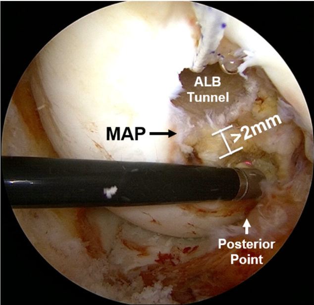 Trung tâm của dấu vết bó sau–trong (posteromedial bundle – PMB) nằm ở vị trí cách đều giữa điểm phía sau và điểm vòm trong (medial arch point), ngay bên dưới mào gian lồi cầu trong (medial intercondylar ridge)⁵. Khác với bó trước–ngoài (ALB), điểm trung tâm của PMB nằm cách bờ sụn 5,8 mm về phía gần⁵. Một mũi khoan 7 mm được sử dụng để tạo đường hầm PMB sâu 25 mm, đồng thời giữ lại một cầu xương rộng 2 mm giữa hai đường hầm (Hình 5).