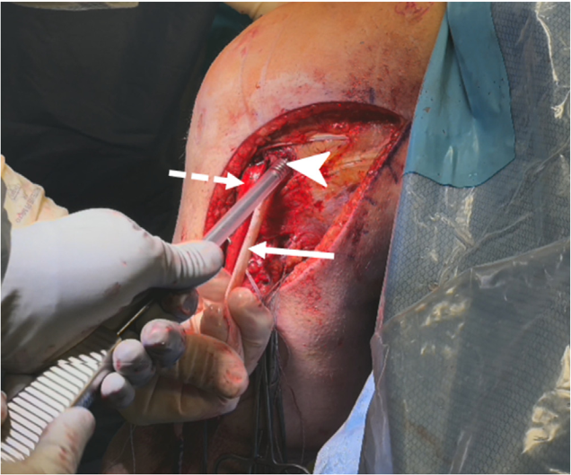 Nội soi khớp gối được tiến hành bằng cách tạo hai đường vào cạnh xương bánh chè bên trong và bên ngoài. Đầu tiên, các đường hầm xương đùi cho dây chằng chéo sau (PCL) được tiếp cận. Bằng cách định vị theo tam giác giữa điểm rãnh lồi cầu (trochlear point) và điểm vòm trong (medial arch point), mũi khoan 11 mm được sử dụng để đánh dấu vị trí của đường hầm bó trước–ngoài (anterolateral bundle – ALB) của PCL⁵. Mép dưới của đường hầm ALB được đặt ngay sát sụn khớp⁵. Sau đó, kim Beath được khoan xuyên qua mũi khoan, đi ra vùng đùi trước–trong, trước khi tiếp tục nong thành một đường hầm kín (closed-socket tunnel) sâu 25 mm (Hình 4).
