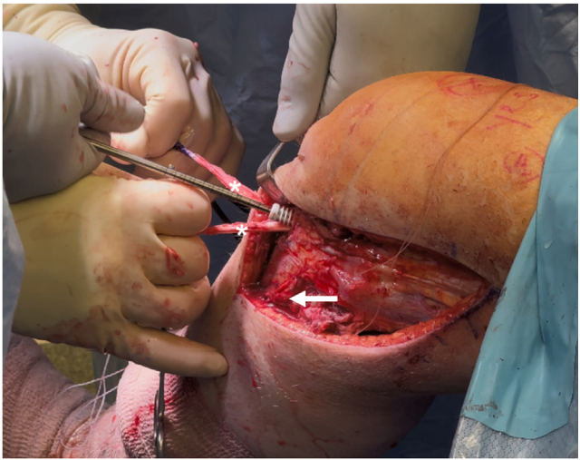 Dây chằng bên mác (FCL) được cố định ở phía trước ngoài bằng vít tự tiêu 7 × 20 mm tại đầu xương mác, khi gối ở tư thế gập 20 độ, xoay trung tính và hơi dạng (valgus nhẹ). Các mảnh ghép dây chằng chéo sau bên (PFL) và gân cơ kheo (PLT) được đưa qua ống xương chày theo hướng từ sau ra trước. Các mảnh ghép này được cố định bằng vít tự tiêu 9 × 20 mm khi gối gập 60 độ và bàn chân ở tư thế xoay trung tính. Phần gân dư thừa còn lại được cắt bỏ (Hình 11).