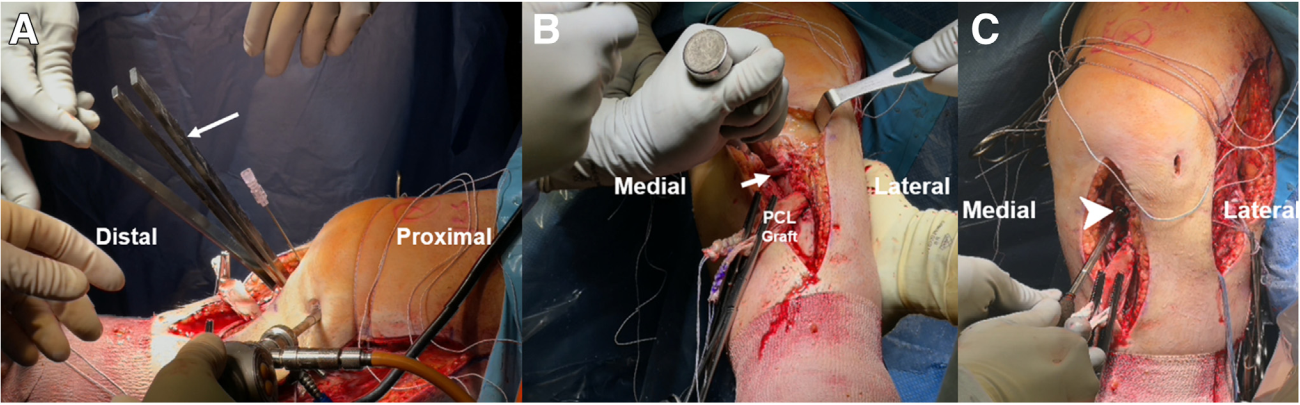Đường hầm xương chày cho dây chằng chéo sau (PCL) được tiếp cận qua ngõ sau–trong. Gờ bó (bundle ridge), nằm giữa vị trí bám tận của bó trước–ngoài (ALB) và bó sau–trong (PMB) trên xương chày, được dùng làm mốc giải phẫu để định vị chốt dẫn hướng. Một đường rạch ở trước–trong được thực hiện, bắt đầu từ đường khớp và kéo dài 8 cm xuống dưới. Dụng cụ định hướng xương chày PCL được đặt tại vị trí cách đường khớp 6 cm, giữa mào chày trước và bờ trong xương chày, và được hướng sao cho đầu chốt dẫn ra tại điểm cách gờ bó 1,3 mm về phía gần⁵. Hình ảnh X-quang trong mổ được sử dụng để xác nhận vị trí chính xác của chốt dẫn, nằm cách “điểm rơi ly champagne” trên mặt cắt bên từ 6 đến 7 mm về phía gần².